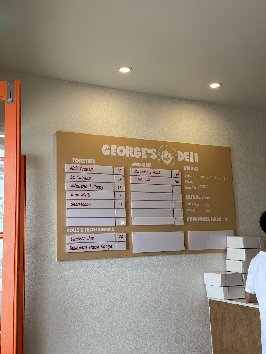 Stepping into George’s Deli, you're enveloped in warm, inviting vibes, perfect for enjoying a casual lunch or breakfast. The decor strikes a balance between modern chic and homey charm, featuring light wood accents and comfortable seating. The hustle and bustle of the café is complemented by the lovely aroma of freshly brewed coffee wafting through the air—definitely one that will awaken your senses and invite you to settle in.